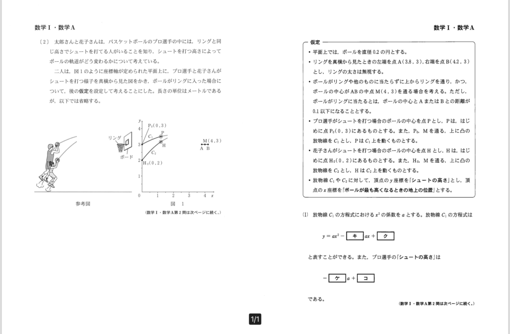共通テストでは、まず数式に入る前の問題設定が込み入っていて、その後も太郎と花子のやり取りを読み解くことが解答のヒントになっているので、計算よりは文章を読んでいる時間の方が長いかもしれません。肝心の設問は、拍子抜けするほど簡単なものから始まり、徐々に難しくなって最後は(試験時間内には)そうそう解けない問題になっています。計算量は以前より少なくなった反面、定義や定理をきちんと理解して活用できるかに重点を置いた設問が増えました。定番の解法を用いたタイプは残念ながらほとんど出題されなくなりましたが、(1)が少し解けなくても仕切り直して(2)は解ける場合は多くなりました。