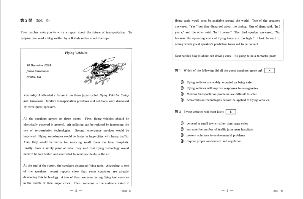 共通テストでは、純粋な文法問題は撤廃され、リーディングは全て長文読解、リスニングとの比率は完全な1:1となりました。総英文量が2倍以上に増えた反面、英文そのものや使用される語彙は以前よりは簡単になっています。やや易しめな英文をサラサラと日本語を介さず英語のまま読めるかがカギになっています。英文の難易度は英検2級から準2級くらいです。